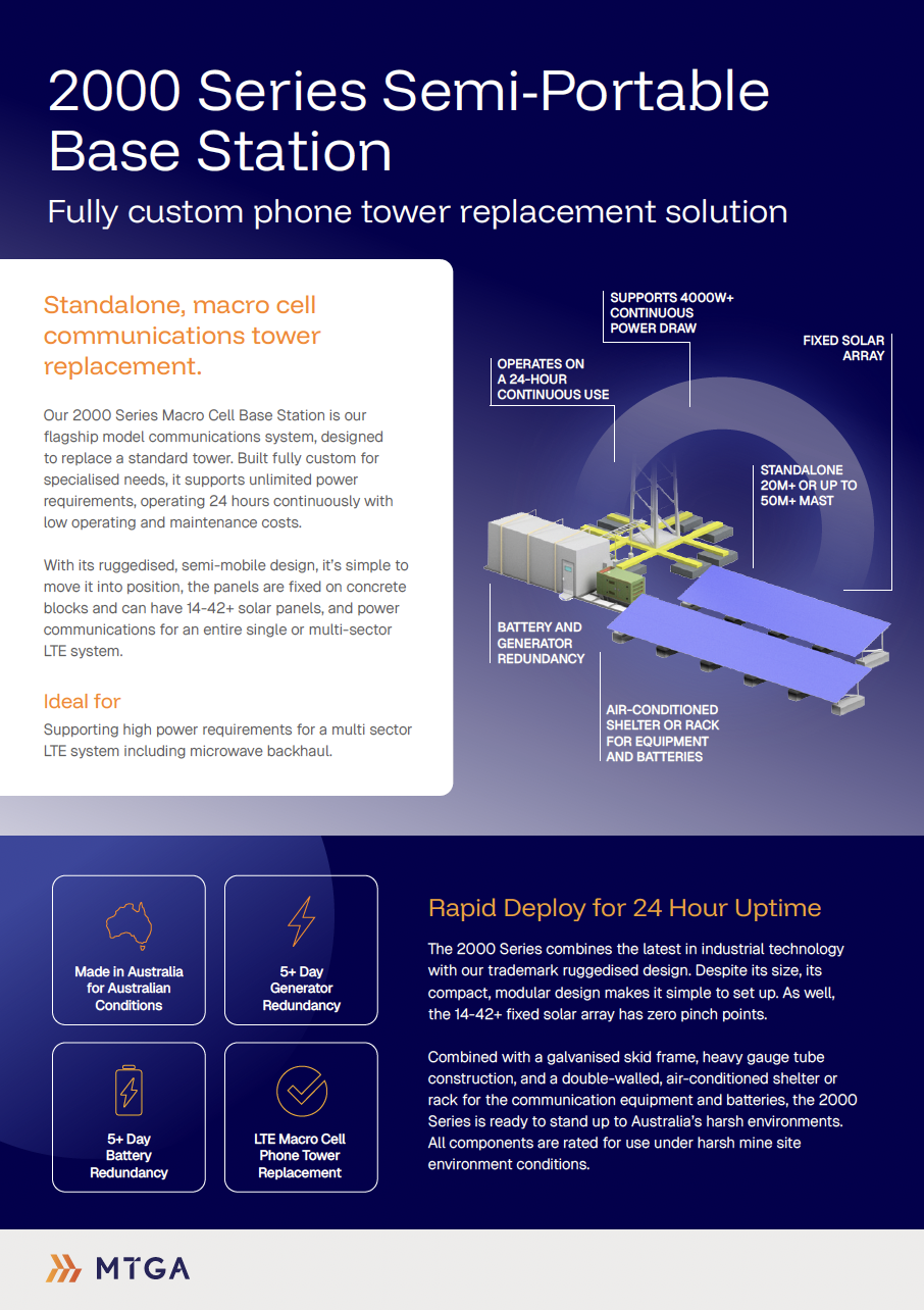 Our 2000 Series Macro Cell Base Station is our flagship model communications system, designed to replace a standard tower. Built fully custom for specialised needs, it supports unlimited power requirements, operating 24 hours continuously with low operating and maintenance costs.