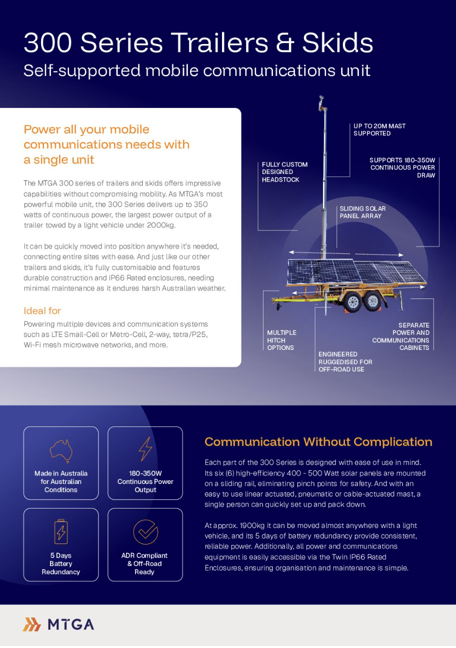 The MTGA 300 series of trailers and skids offers impressive capabilities without compromising mobility. As MTGA’s most powerful mobile unit, the 300 Series delivers up to 350 watts of continuous power, the largest power output of a trailer towed by a light vehicle under 2000kg.