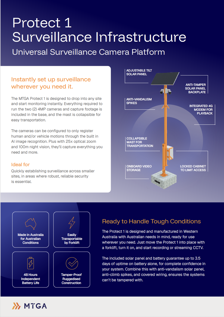 The Protect 1 is designed and manufactured in Western Australia with Australian needs in mind, ready for use wherever you need. Just move the Protect 1 into place with a forklift, turn it on, and start recording or streaming CCTV. The included solar panel and battery guarantee up to 3.5 days of uptime on battery alone, for complete confidence in your system. Combine this with anti-vandalism solar panel, anti-climb spikes, and covered wiring, ensures the systems can’t be tampered with.